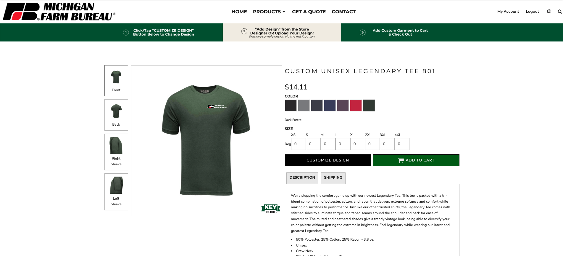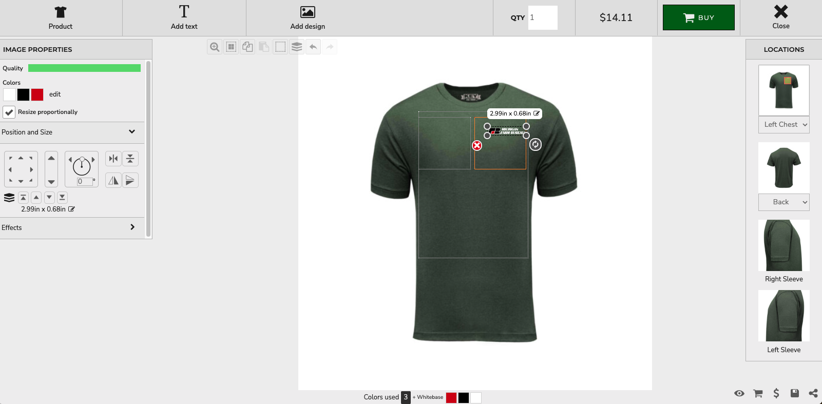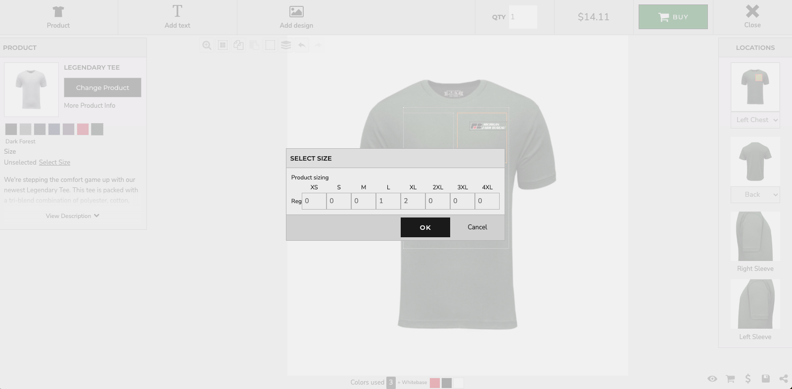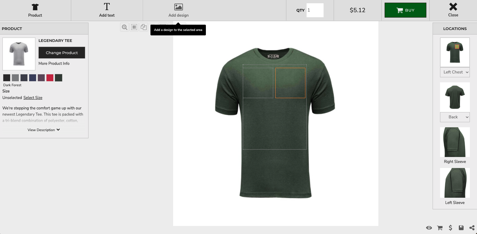 If you select the green "Buy" button before selecting your garment size, the Designer will prompt you to select a size.