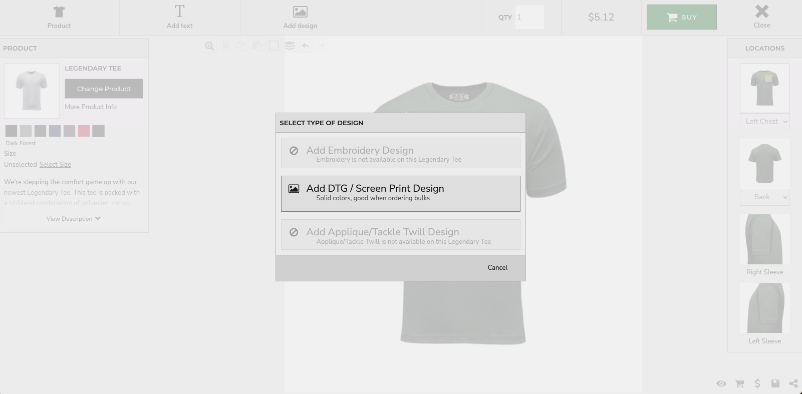 In this example, only DTG and Screen Print designs are available for the product. We selected "Add DTG / Screen Print Design."