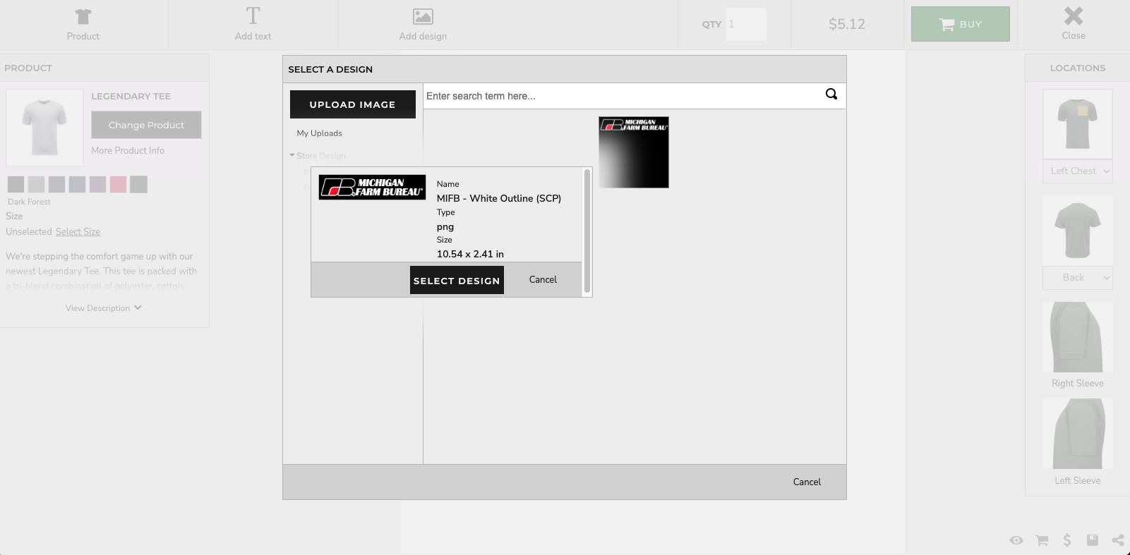 In the left column, under "Store Designs," the Designer will populate all artwork that is available in your store for that item.