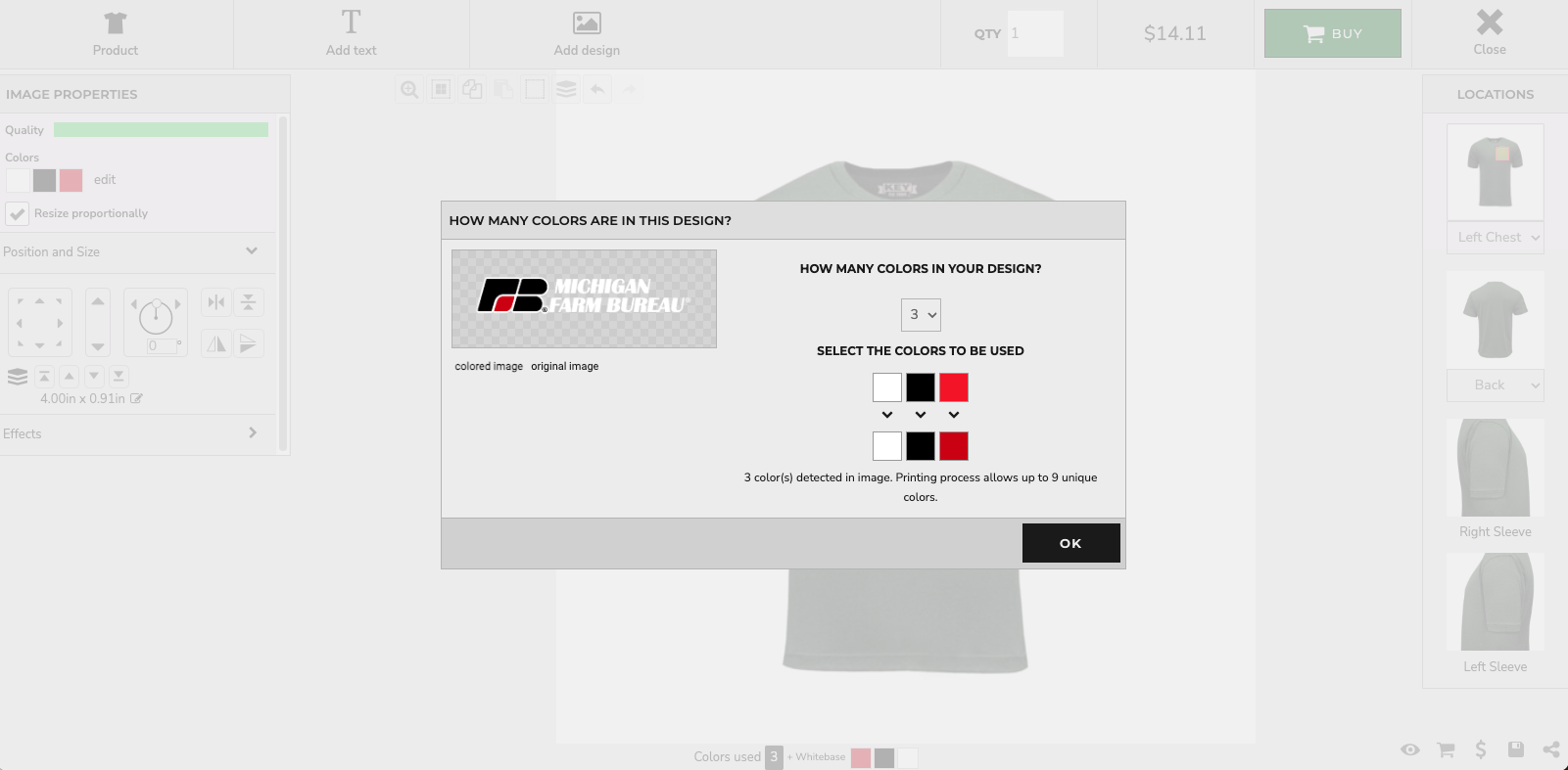 If you select a design with more than 1 color, the Designer will prompt you to identify how many colors are in the design. Select the number of colors.